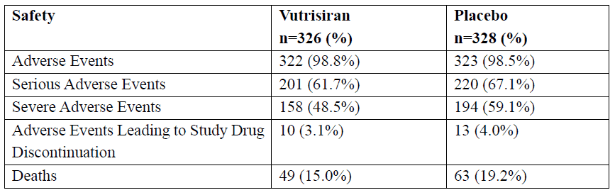 In the study, treatment with vutrisiran substantially reduced the risk of death and cardiovascular events relative to placebo (see table below for further details). In the overall population, vutrisiran reduced the risk of all-cause mortality and recurrent cardiovascular events by 28%, with similar reductions in both the mortality and cardiovascular events components of the endpoint. Mortality in this population was significantly reduced by 31% during the double-blind period and by 36% up to 42 months. In the monotherapy population, vutrisiran significantly reduced the risk of all-cause mortality and recurrent cardiovascular events by 33% and significantly reduced the risk of mortality by 35% up to 42 months. As a component of the primary endpoint, a non-significant reduction of 30% in mortality was observed (nominal p-value 0.1179) in the monotherapy population during the double-blind period.